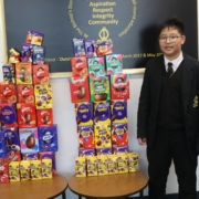 Year 7 student Caleb is checking some of the donated Easter Eggs awaiting collection from Bishop’s Stortford Food Bank.