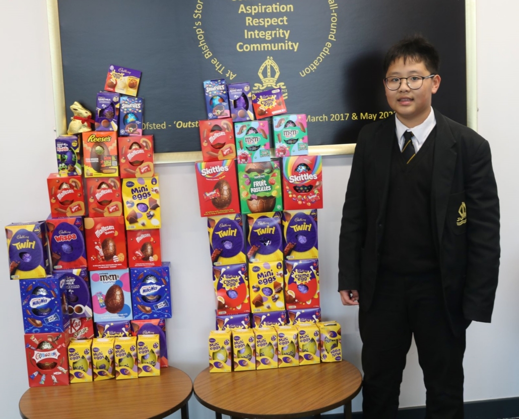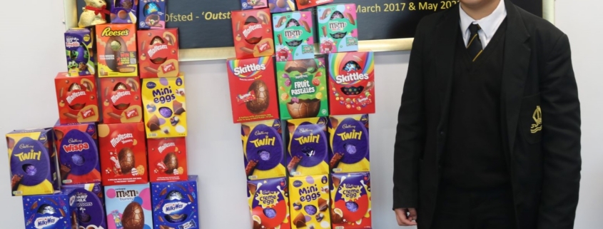 Year 7 student Caleb is checking some of the donated Easter Eggs awaiting collection from Bishop’s Stortford Food Bank.